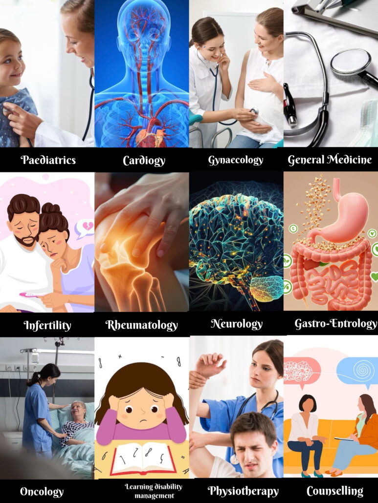 We provide comprehensive care across Paediatrics, Cardiology, Gynaecology, General Medicine, Infertility, Rheumatology, Neurology, Gastroenterology, Oncology, Learning Disability Management, Physiotherapy, and Counselling. With a dedicated team, we aim to deliver holistic treatment tailored to every patient’s needs.